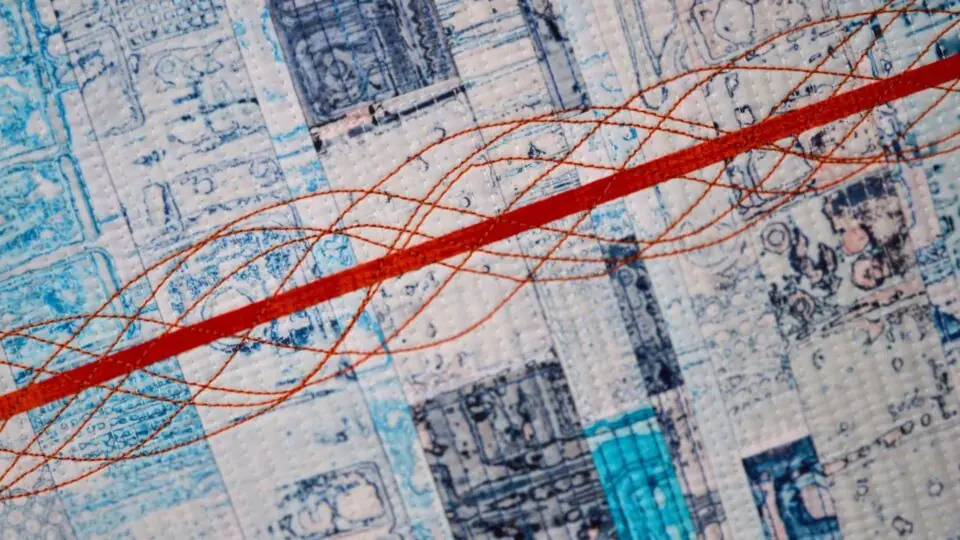 So, what happens when a scientist becomes a textile artist who chooses a printing technique offering zero reliability? As you’ll see below, it’s an incredible mashup of mark-making, colour and stitch.